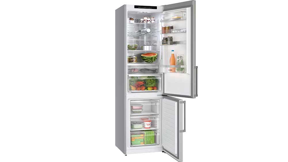 Perfektný prvý dojem urobí kombinovaná chladnička Bosch KGN39AIAU už svojou úspornou energetickou triedou A. Vďaka systému Total No Frost sa jedná o úplne beznámrazový moderný spotrebič s dvoma chladiacimi okruhmi. Netvoria sa žiadne kvapky na zadnej stene. Namŕzanie vo vnútri nedostane žiadnu šancu a vy už nebudete musieť nikdy odmrazovať. Nerezová zadná stena so systémom MultiAirflow zaisťuje stálu cirkuláciu chladného vzduchu, čím je udržovaná konštantná vnútorná teplota. Hlučnosť spotrebiča je iba 29 dB, takže o jeho chode nebudete ani vedieť. Vrchný chladiaci priestor dosahuje objem 260 l a spodnú mraziacu časť 103 l.